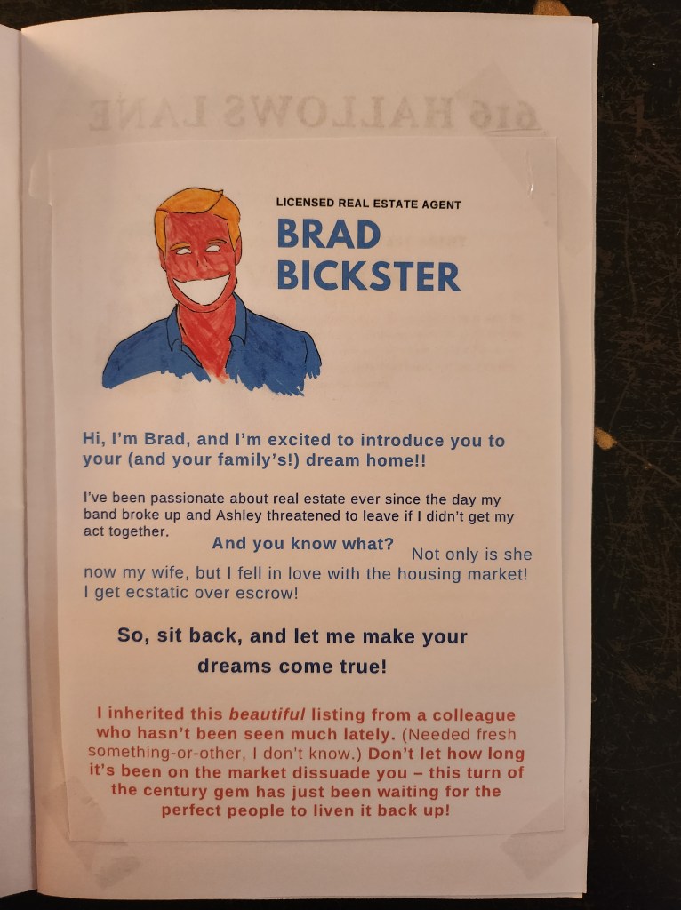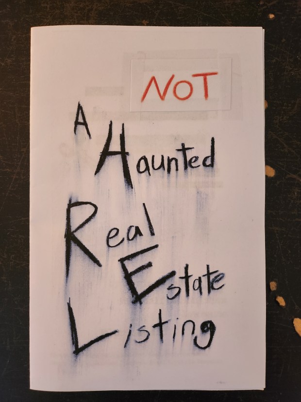 Just a flyer for a house that’s on the market. (It’s a mansion, so it gets its own flyer.) May seem weird that I’d be selling a zine that’s just single real estate listing, but that’s all there is to it. Idk why you’d think it’s haunted?!